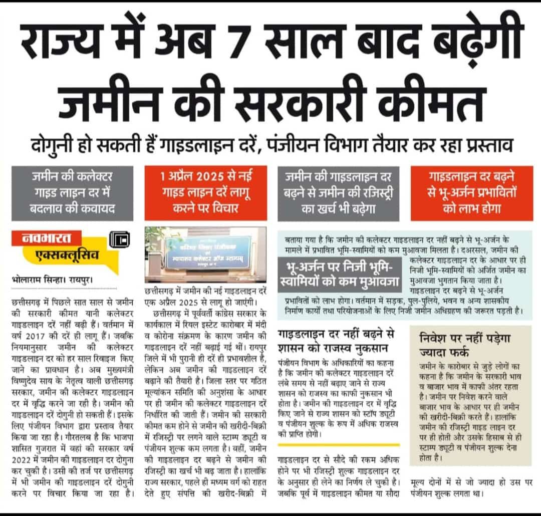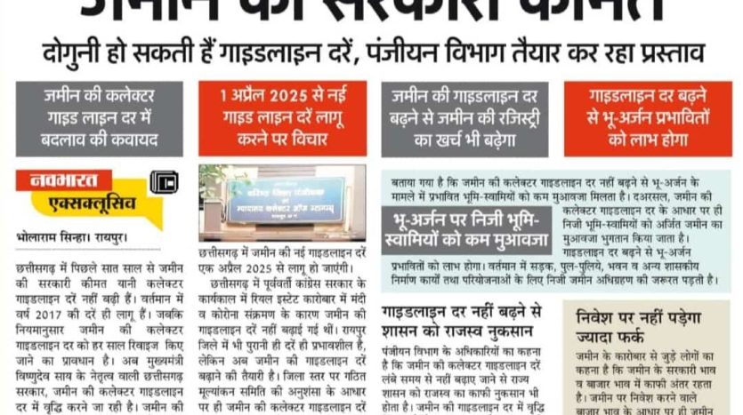 राज्य सरकार अब 7 साल बाद जमीन की सरकारी कीमत यानी कलेक्टर गाइडलाइन दरों में बदलाव करने की तैयारी कर रही है। पंजीयन विभाग इसके लिए प्रस्ताव तैयार कर रहा है, और संभावना है कि 1 अप्रैल 2025 से नई गाइडलाइन दरें लागू हो सकती हैं।